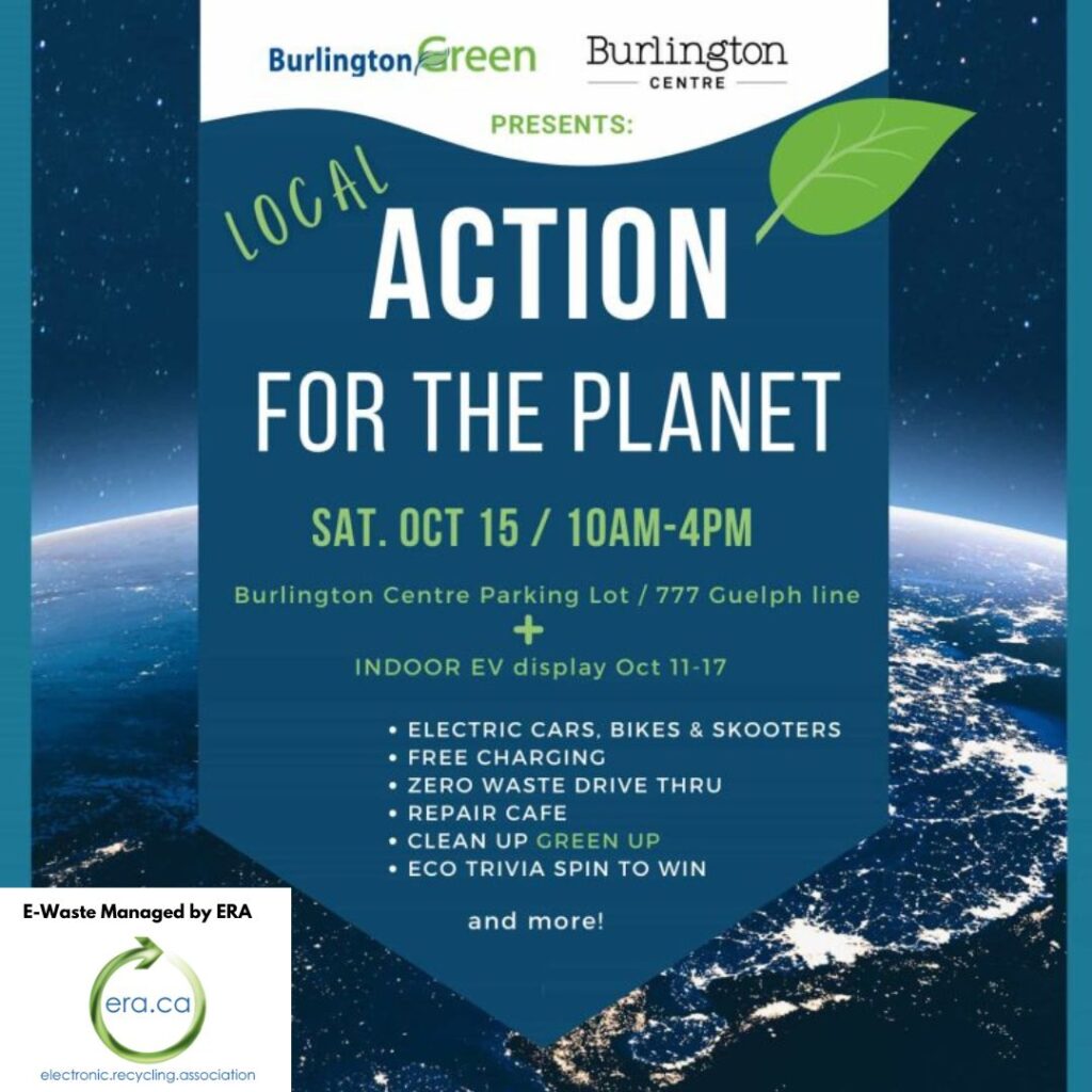 Join us for a full day of action for the planet at this exciting indoor/outdoor event at the Burlington Centre! Bring your e-waste, items for the Repair Cafe, check out EV’s, get some free charging, participate in some eco-trivia and spin to win, and more!