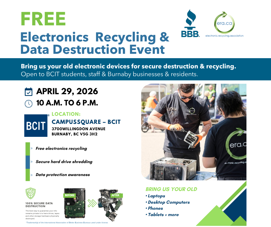 The Electronic Recycling Association (ERA), in partnership with the Better Business Bureau serving Mainland BC, will host a Secure Electronics Recycling and Data Destruction Event in Burnaby, British Columbia, as part of Earth Month 2026.