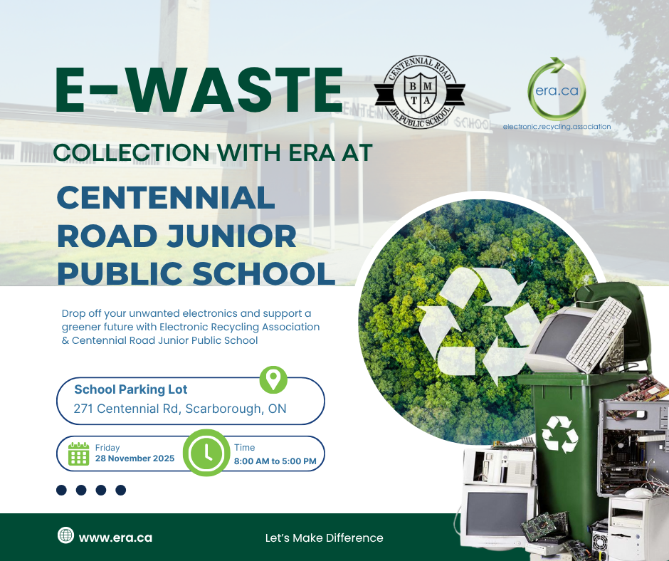 The Electronic Recycling Association (ERA) is proud to continue its partnership with Centennial Road Junior Public School in Scarborough, Ontario, for an E-Waste Collection Event on November 28, 2025.