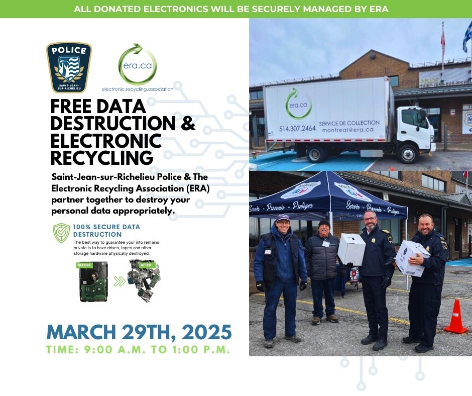 As part of Fraud Prevention Month, the Electronic Recycling Association (ERA) is proud to collaborate with the Saint-Jean-sur-Richelieu Police Service to host a FREE electronic recycling and data security event. Mark your calendars for March 29, 2025, and join us in protecting your personal information while making a positive environmental impact.