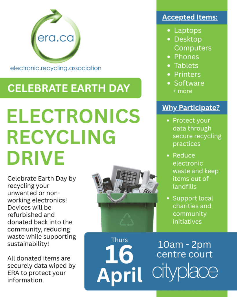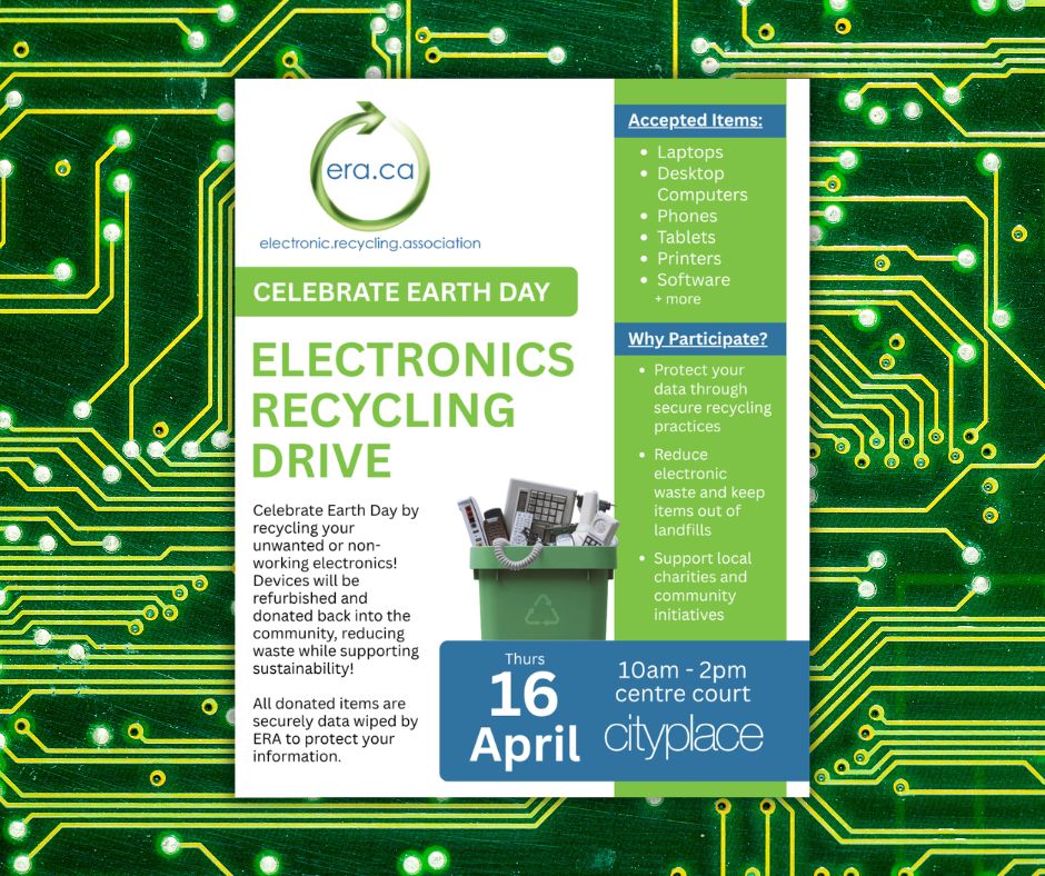 This Earth Day, the Electronic Recycling Association (ERA) is proud to partner with Cityplace Winnipeg to host a community Electronics Recycling Drive, providing a convenient and impactful way to responsibly dispose of unwanted electronics.