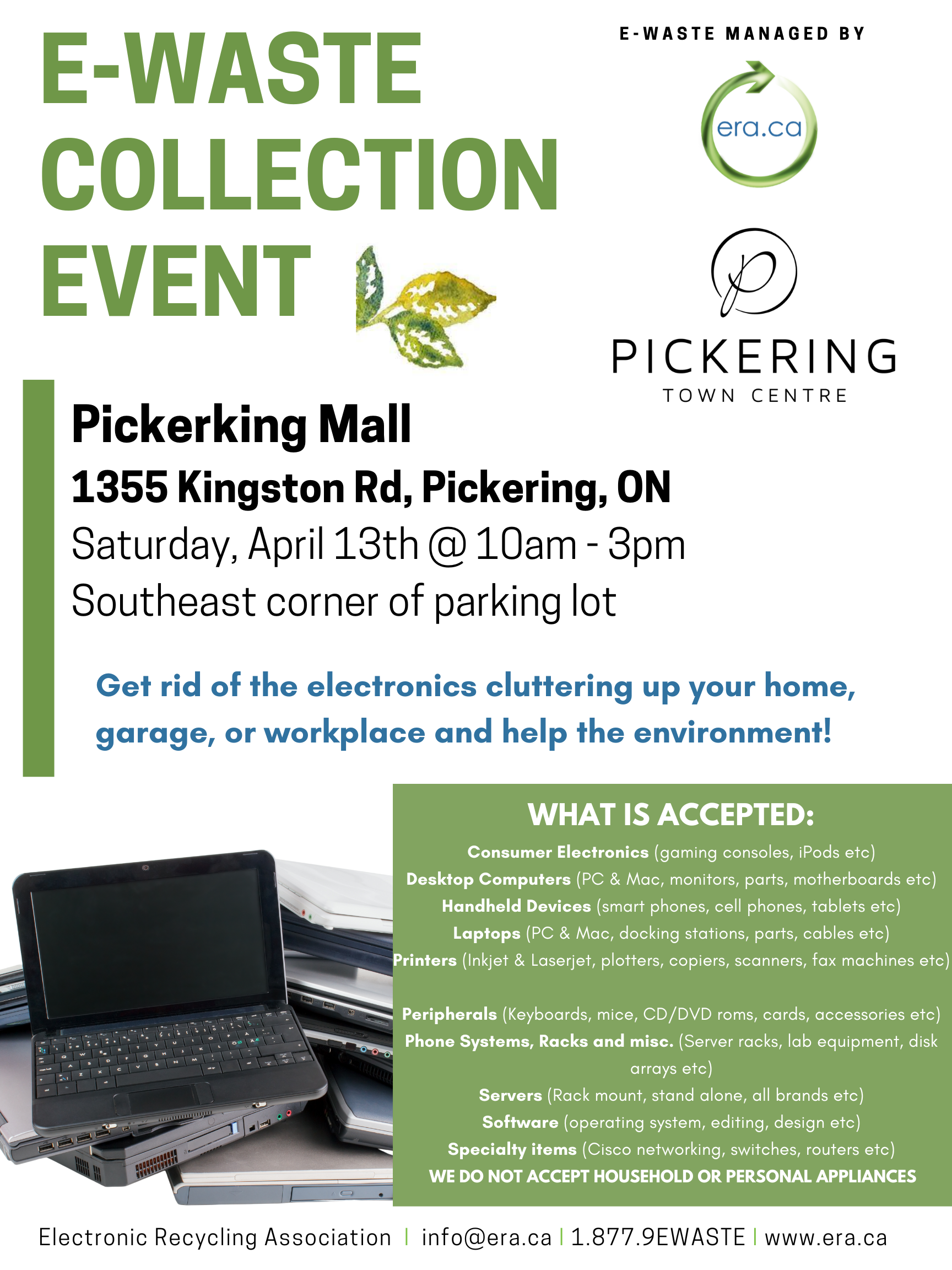 On April 13th, 2024, Pickering Mall is hosting an E-waste Collection Event with the Electronic Recycling Association (ERA), providing a safe and convenient opportunity for community members to responsibly dispose of their unwanted electronics. From old smartphones to outdated laptops, this event encourages individuals to declutter their homes while contributing to a more sustainable future.