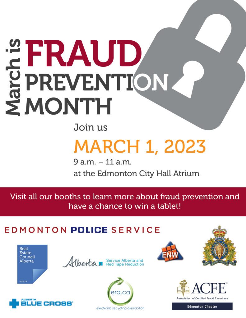 Community partners include Alberta Blue Cross, Association of Certified Fraud Examiners, Edmonton Neighbourhood Watch, Electronic Recycling Association, Edmonton Police Services, RCMP, Real Estate Council of Alberta, and Service Alberta and Red Tape Reduction.
