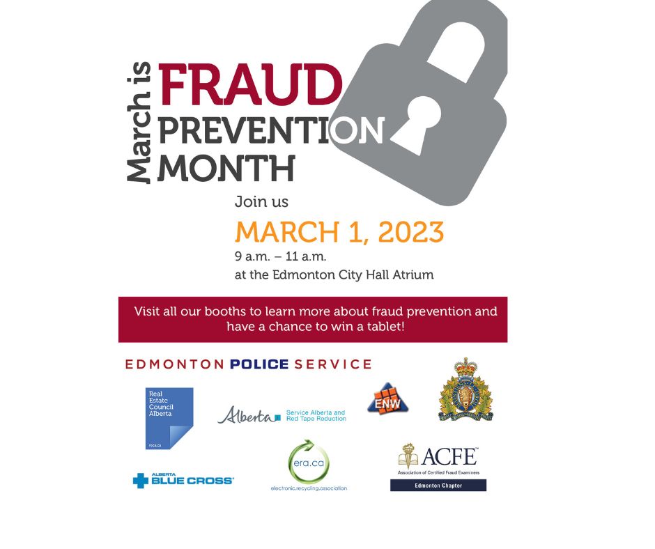 Community partners include Alberta Blue Cross, Association of Certified Fraud Examiners, Edmonton Neighbourhood Watch, Electronic Recycling Association, Edmonton Police Services, RCMP, Real Estate Council of Alberta, and Service Alberta and Red Tape Reduction.