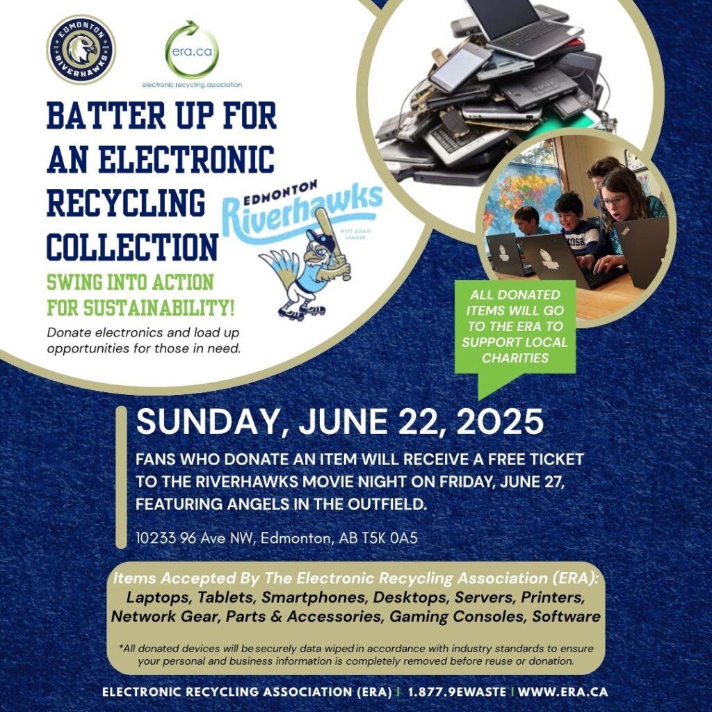 The Electronic Recycling Association (ERA) is pleased to announce a partnership with the Edmonton Riverhawks to host an Electronics Recycling and Collection Event on Sunday, June 22, 2025, at 10233 96 Avenue NW, Edmonton, Alberta.