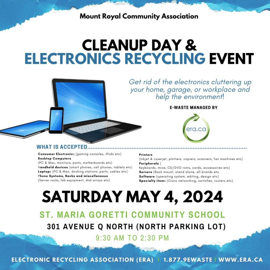 Take a step towards creating a better community by participating in the Mount Royal Community Association’s Cleanup Day event alongside the ERA. Drop off your unwanted electronics, and leave the rest to us!