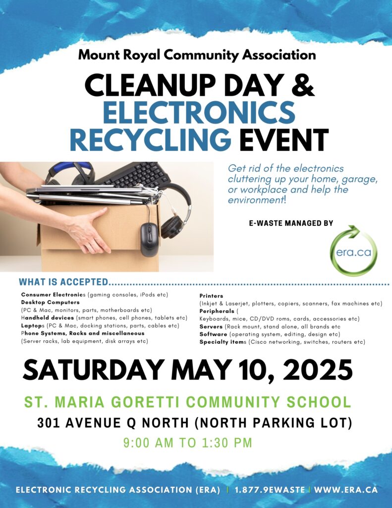 The Electronic Recycling Association (ERA) is proud to support the Mount Royal Community Association’s upcoming Cleanup Day in Saskatoon. Join us on Saturday, May 10, 2025, from 9:00 a.m. to 1:30 p.m. at St. Maria Goretti Community School, 301 Avenue Q N, Saskatoon, SK, S7L 2X7 (North Parking Lot) for a day dedicated to sustainability and community care.