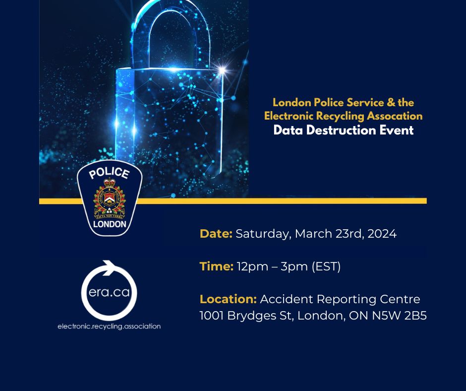 The LPS Cyber Crime Unit and Financial Crime Unit, along with the Electronic Recycling Association (ERA) will be onsite to meet with the public at the Accident Reporting Centre located at 1001 Brydges Street on Saturday, March 23, 2024, from 12 p.m. – 3 p.m. to securely collect and destroy your data. The ERA will gather and safely dispose of old electronics such as gaming consoles, stereo equipment, desktop computers, laptops, handheld devices, printers, accessories, phone systems, servers, software, and routers.