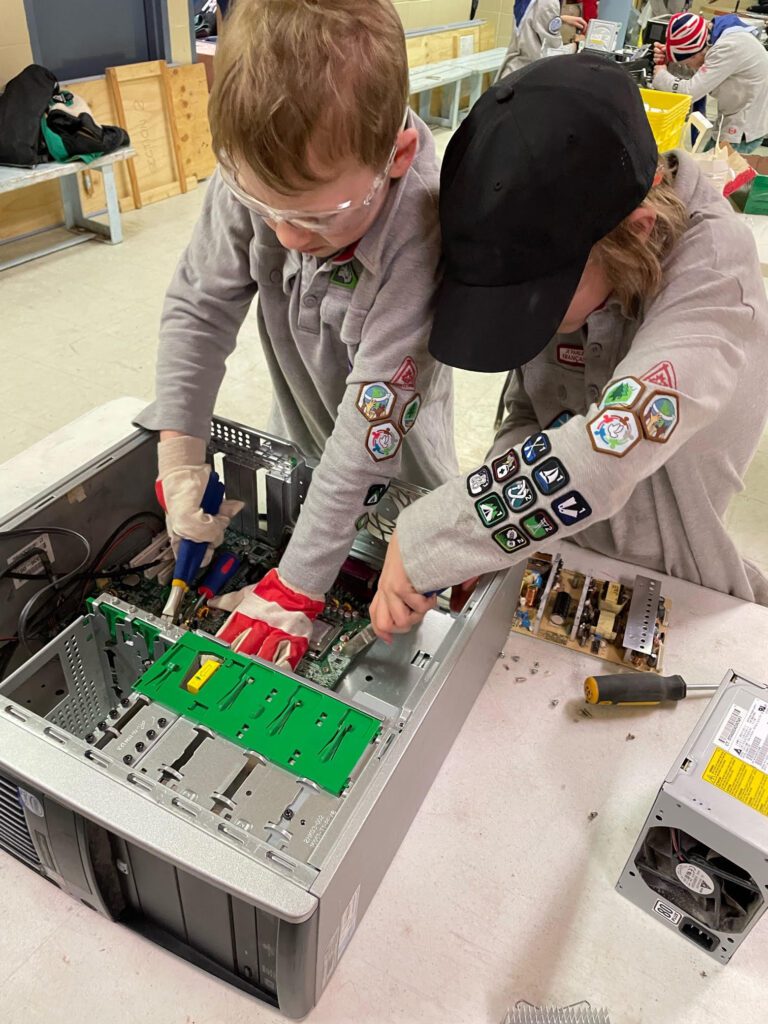 Armed with safety gear and basic tools, the youth were happily occupied examining and destroying for nearly an hour. After Scout leaders managed to get them to put down their tools, they reminded them that electronic disassembly is only possible with the permission and supervision of an adult. Many of the kids asked if they could take home some of the components they removed. Here are some of the comments from the activity: