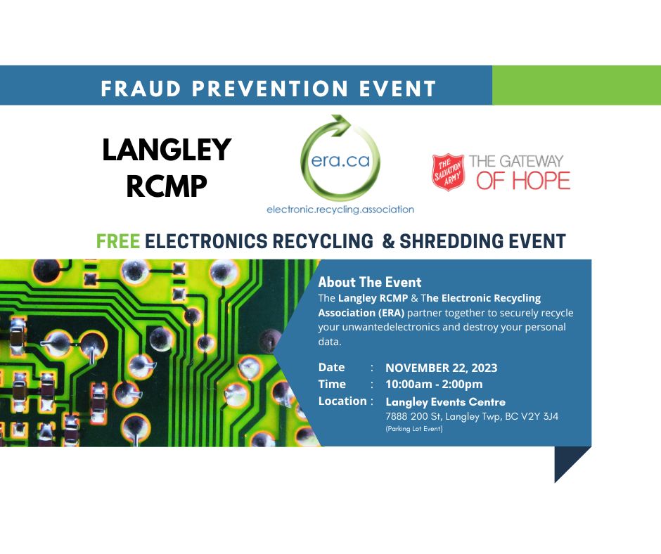 Langley RCMP has teamed up with the Electronic Recycling Association (ERA) to safeguard your sensitive information. Mark your calendars for November 22, 2023, as we invite you to a crucial event from 10:00 AM to 2:00 PM at the Langley Events Centre, located at 7888 200 St, Langley Twp, BC V2Y 3J4.