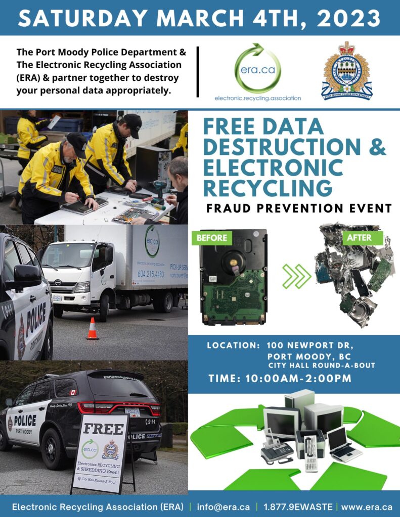 In support of Fraud Prevention Month, the Electronic Recycling Association (ERA) and the Port Moody Police Department are partnering, to help protect your private information through data destruction.