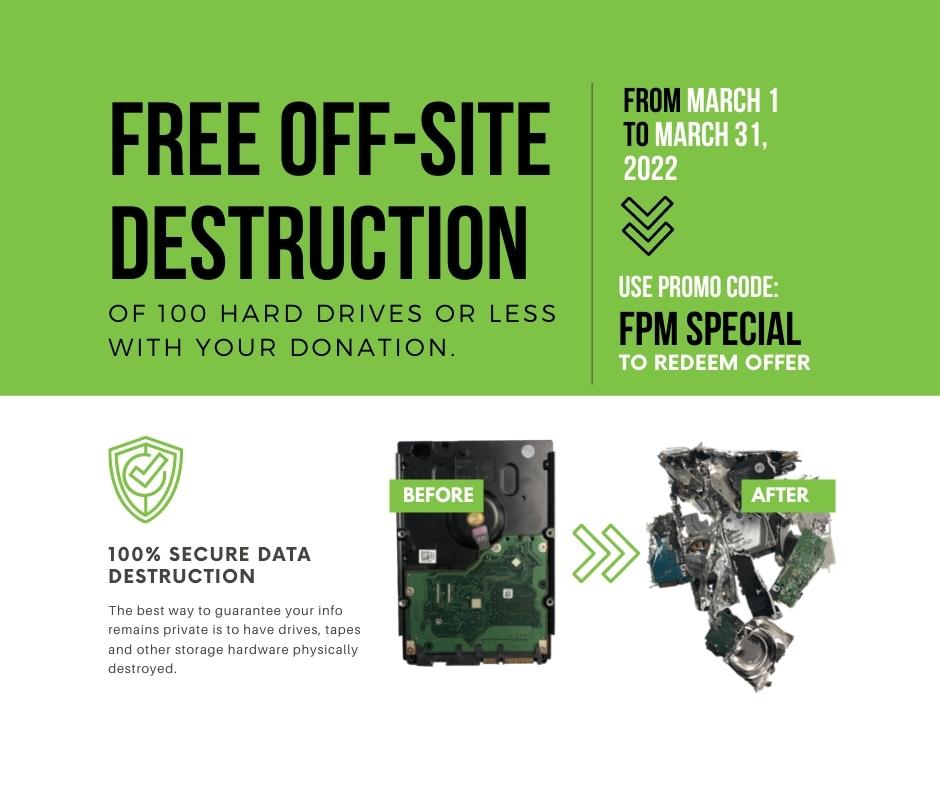 In honor of Fraud Prevention Month (FPM) the ERA is offering Free Offsite Data Destruction all month long of 100 hard drives or less with your donation. Use promo code FPM SPECIAL when booking.