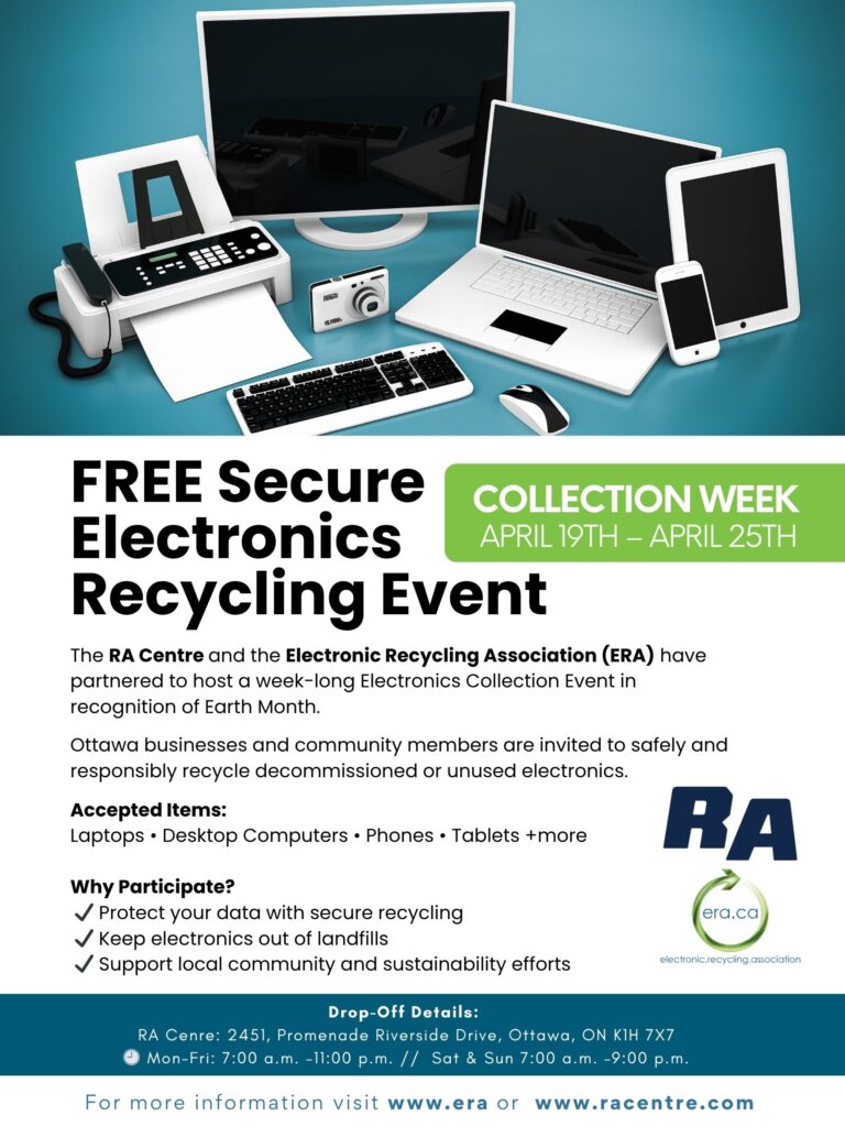 In recognition of Earth Month, the Electronic Recycling Association (ERA) is proud to partner with the RA Centre to host a week-long free electronics recycling event in Ottawa. From April 19 to April 25, individuals and organizations are invited to drop off unwanted or decommissioned electronics for safe, secure, and environmentally responsible recycling.
