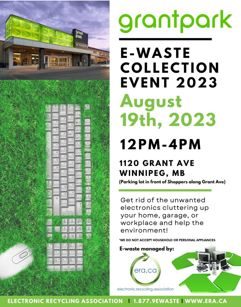 If so, bring them to Grant Park Shopping Centre on Saturday, August 19th, 2023 where the Electronic Recycling Association will collect and securely dispose of them for you at no charge!