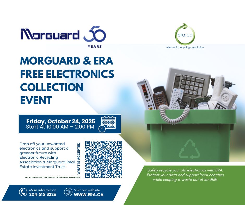 The Electronic Recycling Association (ERA) is proud to partner with Morguard Real Estate Investment Trust to host a Free Electronics Recycling Collection Event at Charleswood Centre in Winnipeg. This community-focused initiative makes electronics recycling easy for residents and businesses, while promoting responsible e-waste management and environmental sustainability.