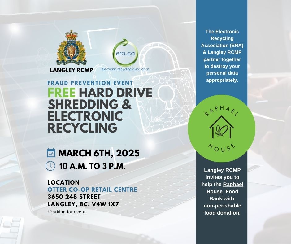 The Electronic Recycling Association (ERA) is partnering with Langley RCMP for Fraud Prevention Month to help you securely dispose of your personal data. Join us for a special Data Security and Electronic Recycling Disposal Event!