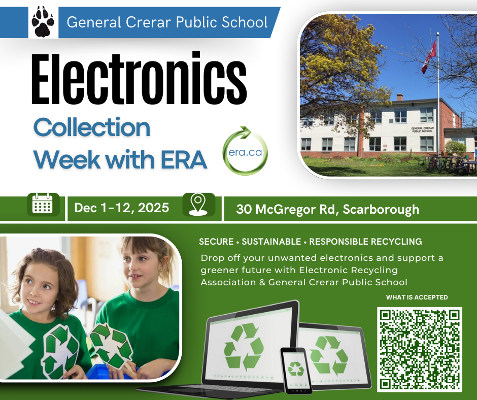 The Electronic Recycling Association (ERA) is pleased to highlight its partnership with General Crerar Public School in Scarborough, Ontario, for a two-week community e-waste collection initiative dedicated to promoting responsible electronic recycling and environmental awareness.