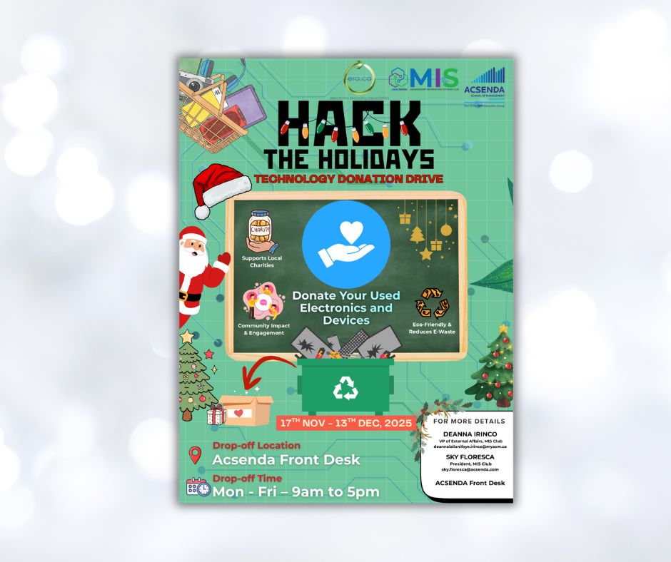 This holiday season, the Electronic Recycling Association (ERA) is partnering with the MIS Club at Acsenda School of Management for Hack the Holidays, a technology donation campaign that supports digital access, community empowerment, and environmental sustainability.