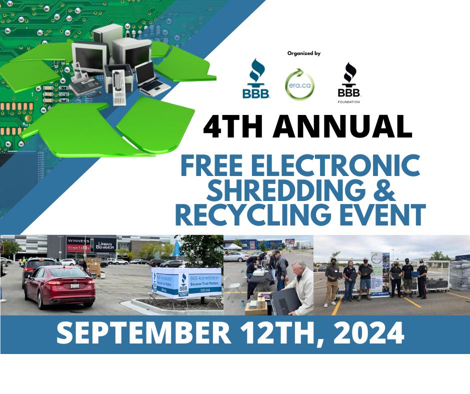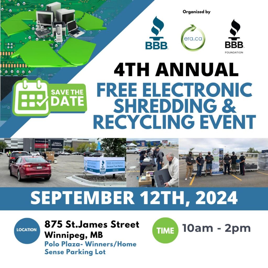 The Electronic Recycling Association (ERA) is collaborating with the BBB of Central Canada, along with the BBB Education Foundation to present a FREE event focused on shredding and recycling electronics. This event is designed for local businesses and consumers and will take place on September 12th, 2024, at Polo Plaza -Winners/HomeSense parking lot, located at 875 St. James Street, Winnipeg, Manitoba. The event will run from 10 am to 2 pm.