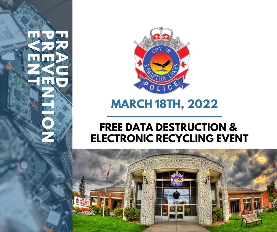 The Electronic Recycling Association (ERA) are partnering with the Kawartha Lakes Police Services on March 18th, 2022 for Fraud Prevention Month. The ERA will be shredding hard drives, phones, tapes and other small devices holding sensitive data from the Police department and the public. We intend on educating the public on how important it is to dispose of their unwanted and old electronics correctly so that the data doesn’t find itself in another person’s possession. This will be a day to educate and supply answers to all of the publics’ fraud-related questions.
