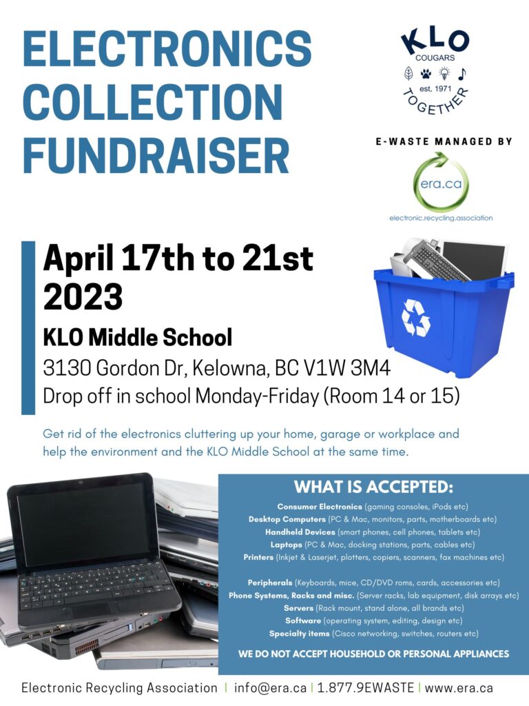 The Electronic Recycling Association (ERA) has partnered with KLO Middle School in Kelowna, BC, for an Electronics Collection Fundraiser to help raise money for the school. You can drop off your unwanted electronics and the ERA will work to refurbish collected items and donate them to organizations and individuals in need!