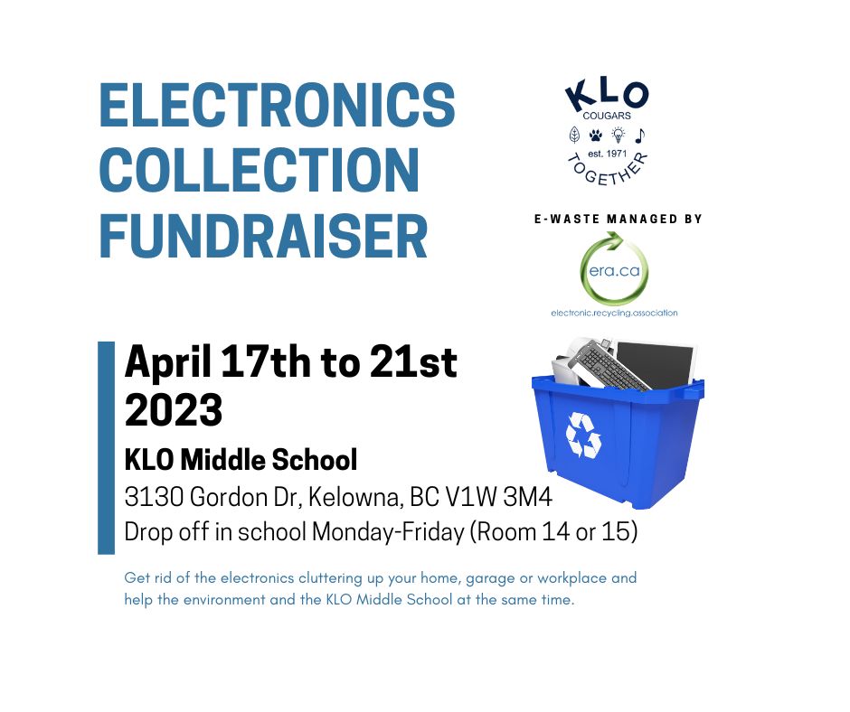 The Electronic Recycling Association (ERA) has partnered with KLO Middle School in Kelowna, BC, for an Electronics Collection Fundraiser to help raise money for the school. You can drop off your unwanted electronics and the ERA will work to refurbish collected items and donate them to organizations and individuals in need!