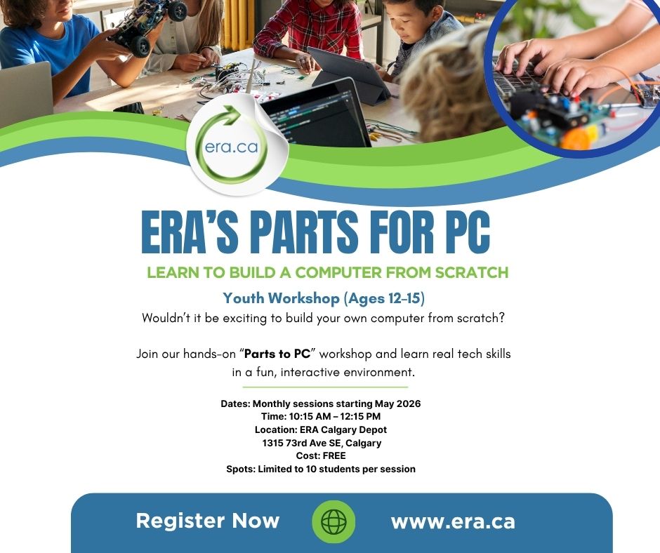 The Electronic Recycling Association (ERA) is excited to announce the return of our “Parts to PC” youth workshop in Calgary this May 2026. This hands-on program is designed to inspire the next generation of tech enthusiasts by teaching real-world computer skills in a fun and engaging environment.