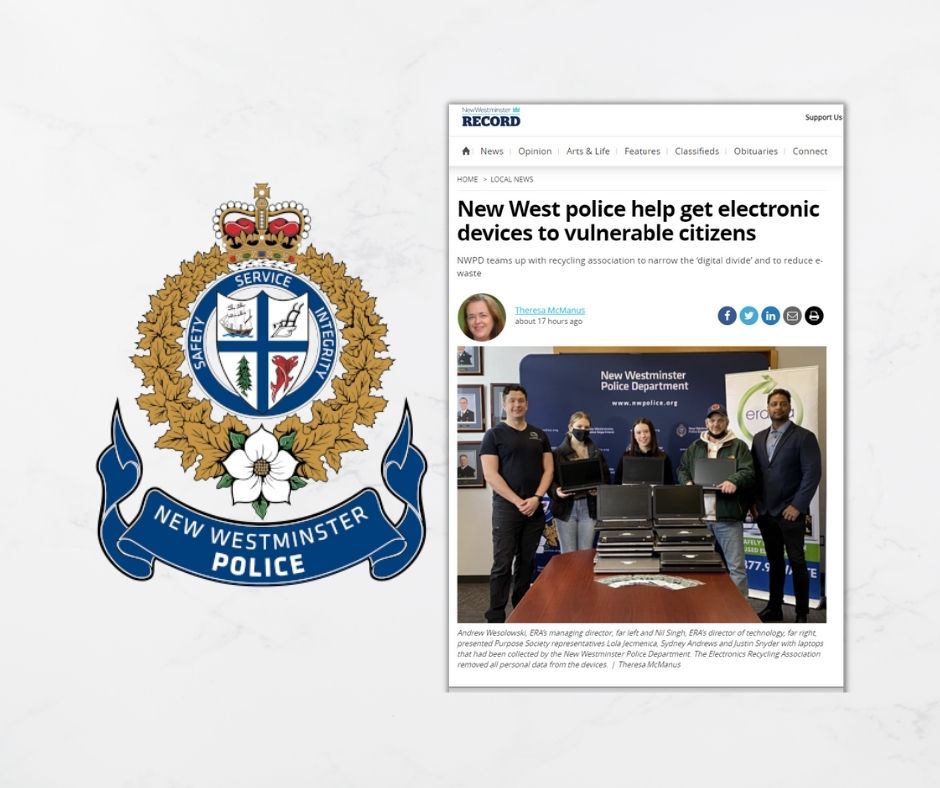 The New Westminster Police Department and the Electronic Recycling Association are providing 35 electronic devices to the clients of the Lower Mainland Purpose Society for Youth and Families, Dress for Success Vancouver, Big Brothers of Greater Vancouver and the Delta Stroke Recovery Society.