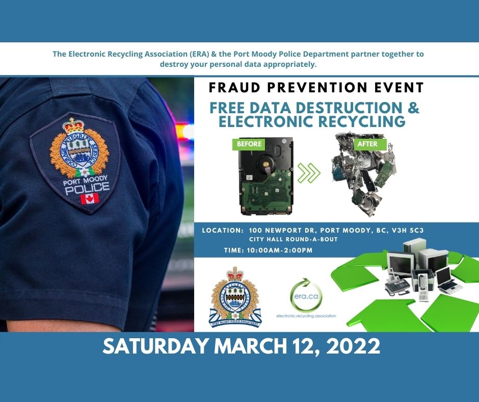 In support of Fraud Prevention Month, the ERA and the Port Moody Police Services partnered together to help protect your private information through data destruction. We held an electronics collection and data shredding event on March 12th to encourage citizens to bring unwanted electronic devices such as hard drives, computers, laptops, phones, tablets, tapes and other small devices storing sensitive data, where they were securely destroyed OR wiped clean and re-used for FREE.