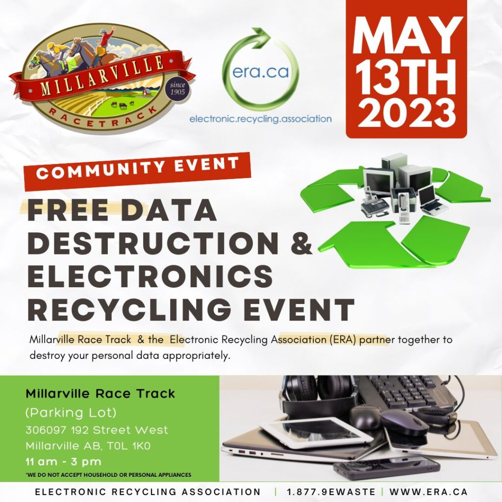 On May 13th, 2023, the Electronic Recycling Association (ERA) and the Millarville Race Track will be hosting a free data shredding and electronic recycling event called the “Community Shred and Electronic Disposal Day” at the Millarville Race Track parking lot (306097 192 Street West Millarville, AB, T0L 1K0) in Alberta, Canada.