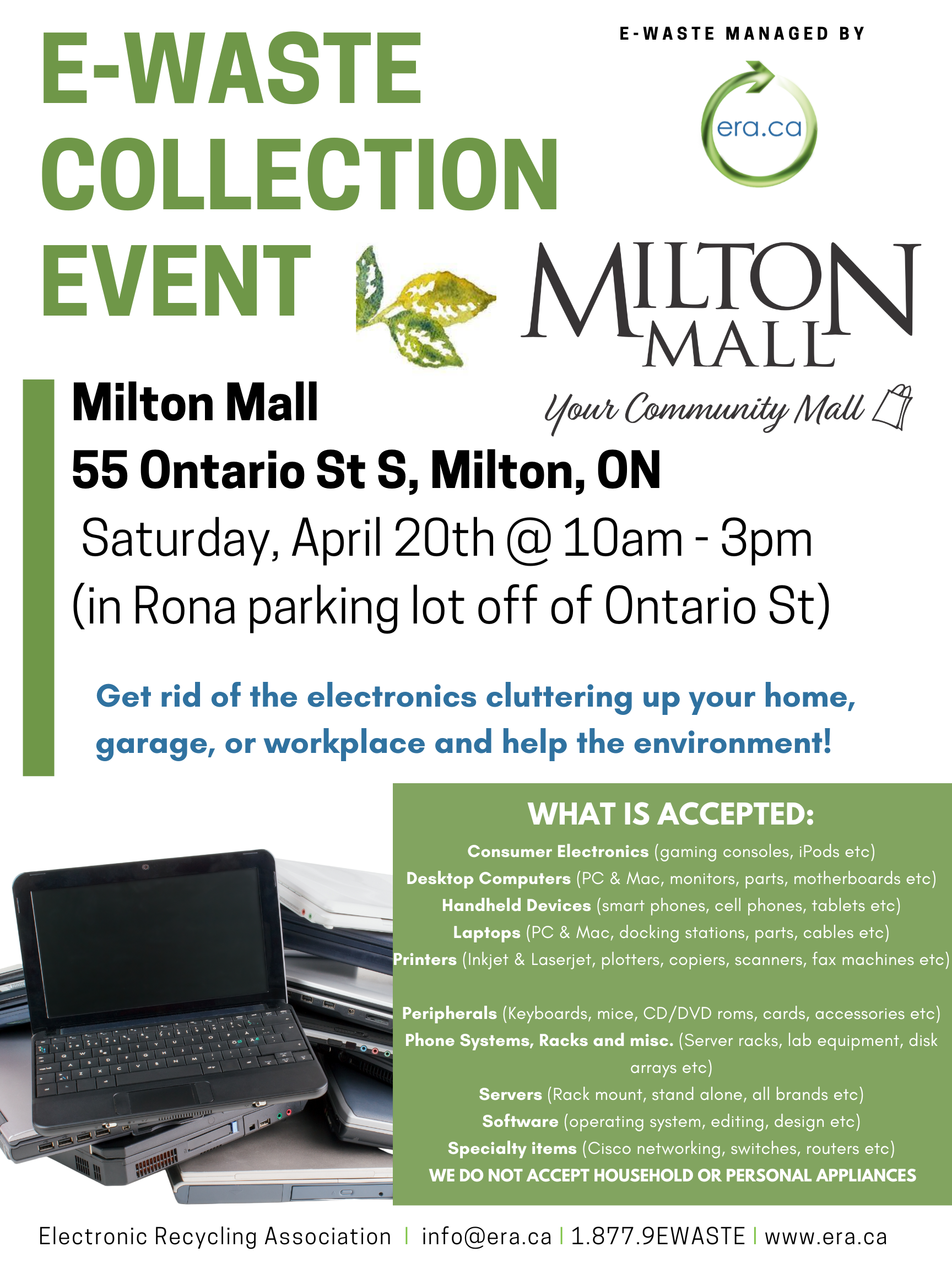 Milton Mall in Ontario is gearing up to make a significant impact on April 20th, 2024, by hosting an E-Waste Collection Event in collaboration with the Electronic Recycling Association (ERA). This partnership aims to not only provide a convenient avenue for the community to dispose of electronic waste responsibly but also to support a cause that champions environmental sustainability and community welfare.