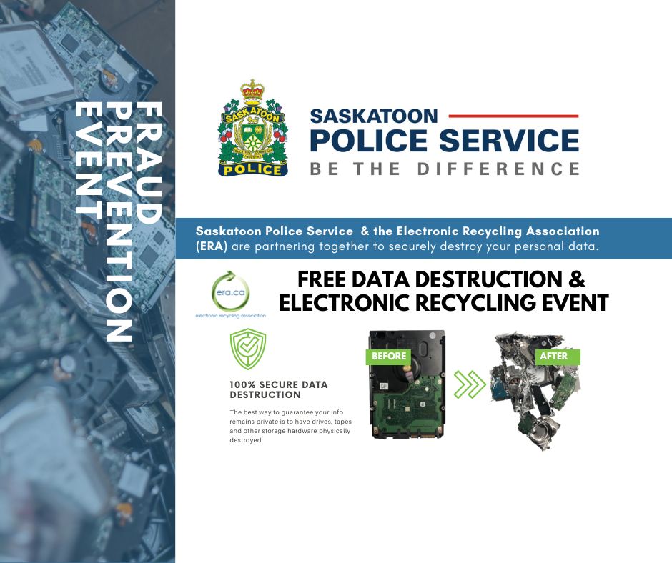We are excited to announce that the Saskatoon Police Department and the Electronic Recycling Association (ERA) are partnering for Fraud Prevention Month to offer free electronics recycling and data destruction event.