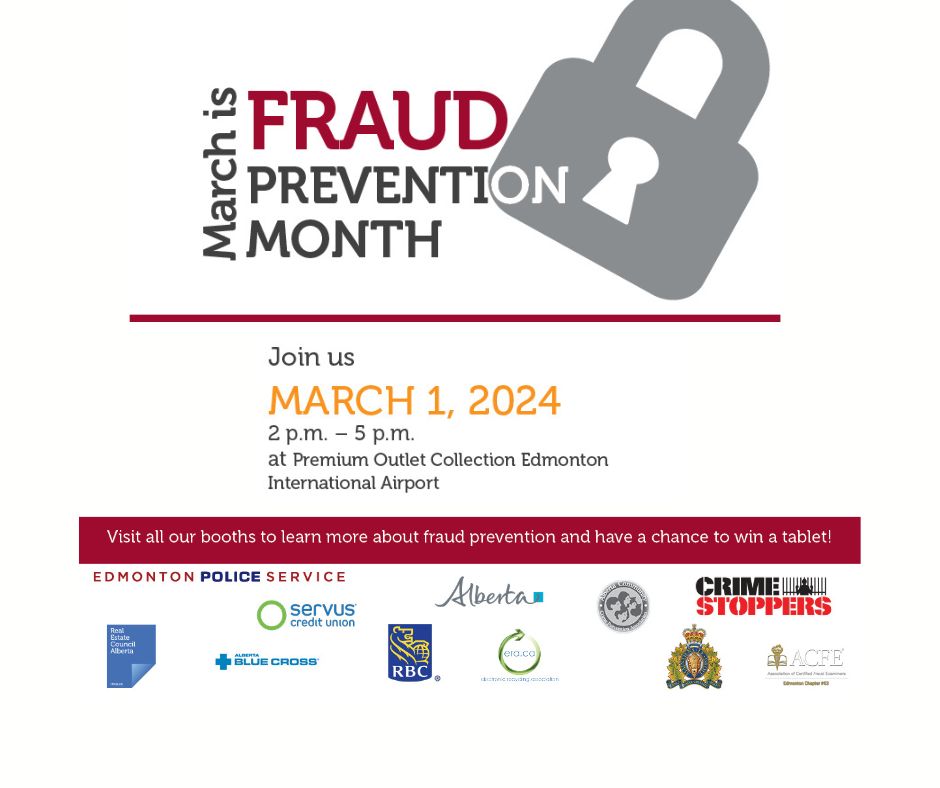 March is Fraud Prevention Month, and there’s no better time to arm yourself with knowledge about protecting your personal information and assets from scammers and fraudsters. To mark the beginning of this crucial month, join us at the Premium Outlet Collection Edmonton International Airport on Friday, March 1st, from 2 – 5 p.m. for an informative and interactive event aimed at empowering you with the tools to combat fraud.