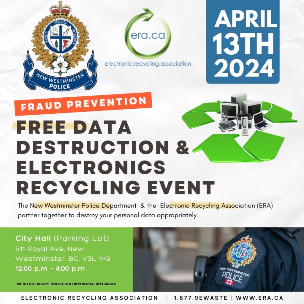 New Westminster – The New Westminster Police Department is partnering with the Electronic Recycling Association (ERA) to offer free electronics recycling and data destruction on April 13th, 2024 from noon to 4:00 pm in the parking lot at City Hall, located at 511 Royal Ave, New Westminster, BC, V3L 1H9.