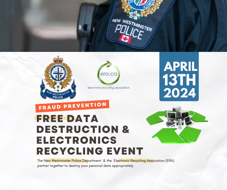 New Westminster – The New Westminster Police Department is partnering with the Electronic Recycling Association (ERA) to offer free electronics recycling and data destruction on April 13th, 2024 from noon to 4:00 pm in the parking lot at City Hall, located at 511 Royal Ave, New Westminster, BC, V3L 1H9.