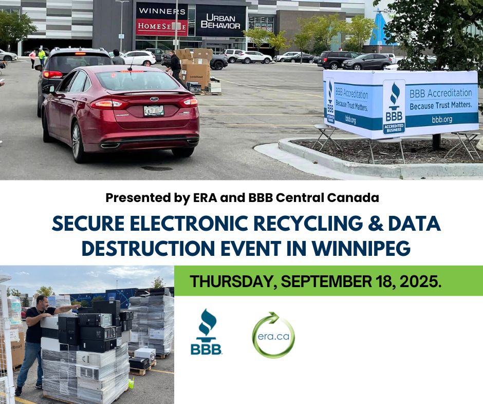 The Electronic Recycling Association (ERA), in partnership with the Better Business Bureau of Central Canada, is excited to host a free electronic recycling and data destruction event in Winnipeg, Manitoba on Thursday, September 18, 2025.